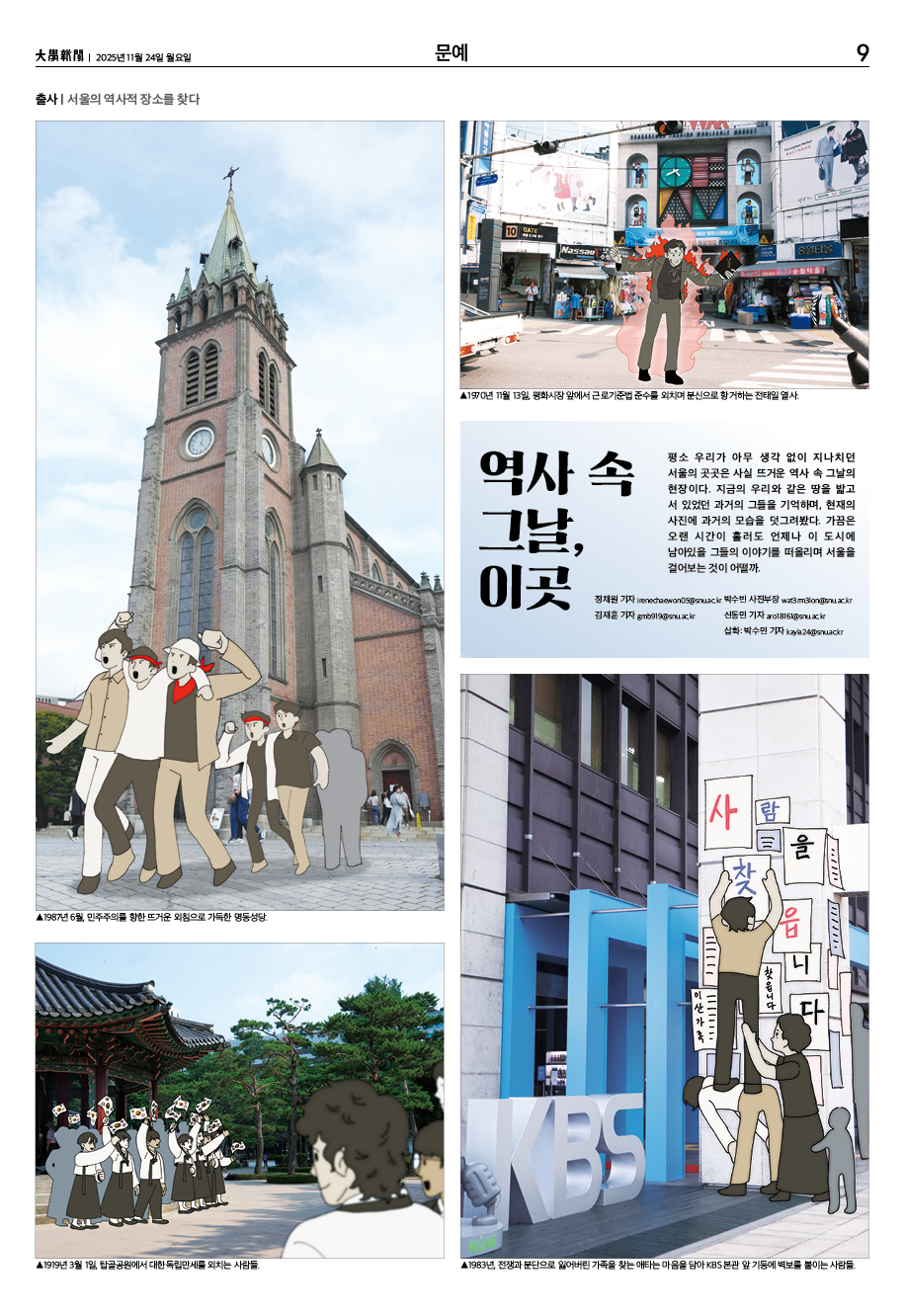 평소 우리가 아무 생각 없이 지나치던 서울의 곳곳은 사실 뜨거운 역사 속 그날의 현장이다. 지금의 우리와 같은 땅을 밟고 서 있었던 과거의 그들을 기억하며, 현재의 사진에 과거의 모습을 덧그려봤다. 가끔은 오랜 시간이 흘러도 언제나 이 도시에 남아있을 그들의 이야기를 떠올리며 서울을 걸어보는 것이 어떨까.